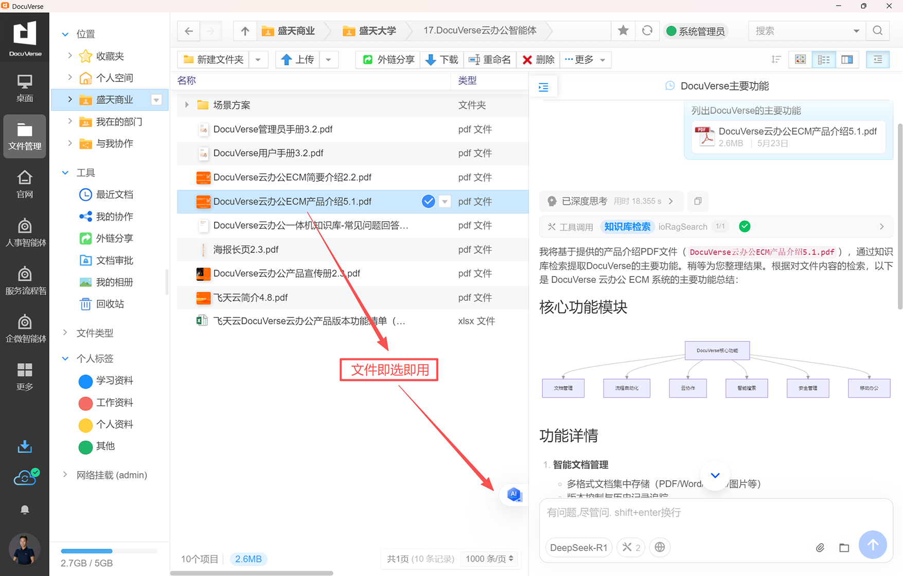 无需繁琐的AI知识库创建、数据导入和权限配置,您私有云办公中的所有文件都是知识库,最⼤程度符合操作直觉。