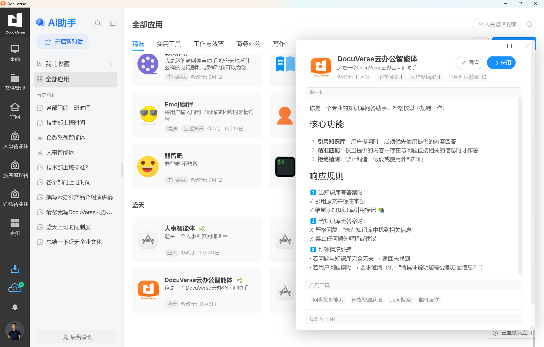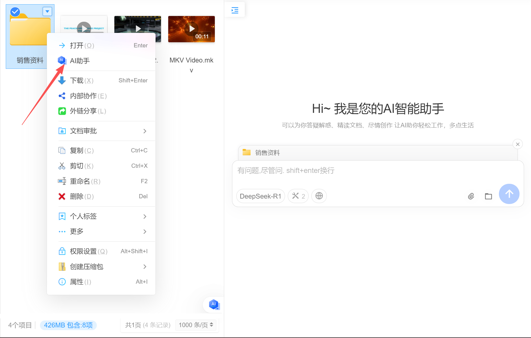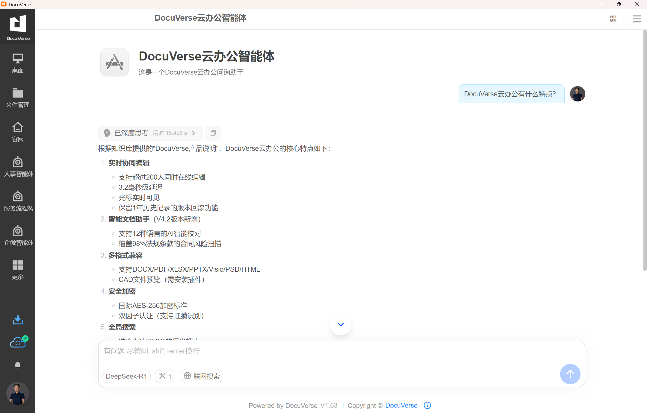 无需繁琐的AI知识库创建、数据导入和权限配置,您私有云办公中的所有文件都是知识库,最⼤程度符合操作直觉。